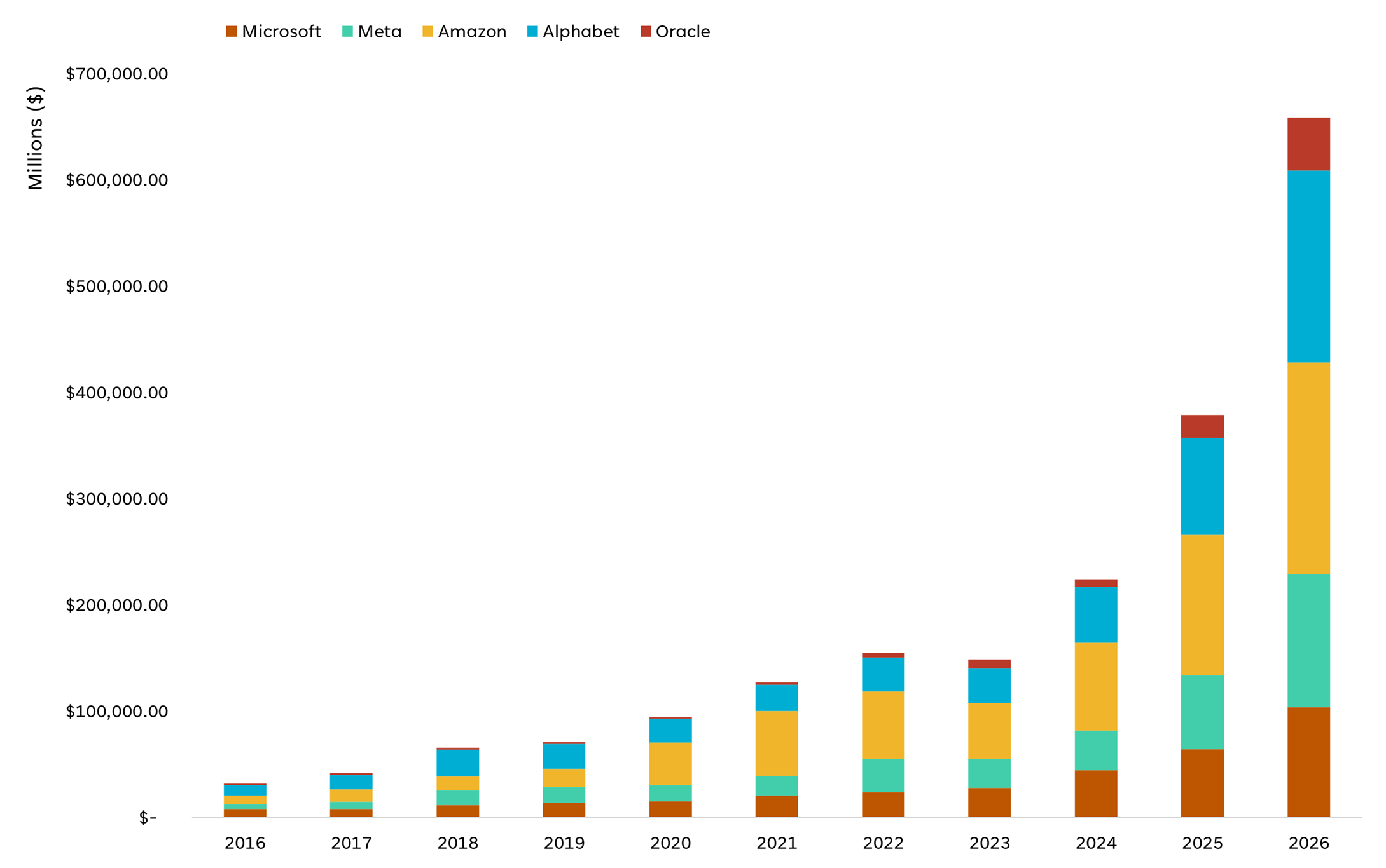 Capital markets have faced quite an array of moving pieces over the last couple of weeks, ranging from equity market rotation dynamics, volatile metals and commodity price action, geopolitical flare-ups, global central bank decisions, and high-profile earnings. Focusing on earnings, the five U.S. firms dubbed as data center and artificial intelligence (AI) hyperscalers — Google-parent Alphabet (GOOG/L), Microsoft (MSFT), Amazon (AMZN), Meta (META), and Oracle (ORCL) — recently reported broadly upbeat quarterly results. But it was their spending plans that lived up to the hyperscale moniker and drew the spotlight.