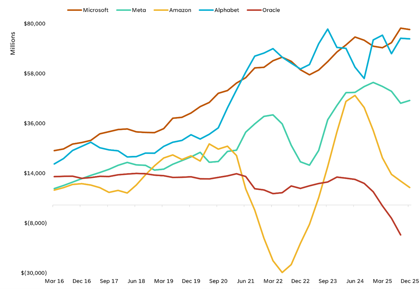 Although META was an exception to the risk off response, and taking a look under the hood free cash flow was likely a primary factor in allowing the Facebook and Instagram parent to hold up a bit better than its peers. Without diving too deep into financial statement analysis, META’s trailing 12-month free cash flow balance was the only one of the five hyperscalers to gain ground from the prior quarter. While the social technology firm’s capex for last quarter and the year ahead both surprised to the upside, the rise in cash flow balances underpinned Wall Street’s confidence that it is on solid footing for the projected outlays. Outside of META, the remaining four firms all posted a decline in cash flow, kindling jitters that elevated 2026 spending guidance may shorten the timeline on when some (if any) begin to bleed cash — especially considering some (including GOOG/L and ORCL) have already begun to dip into credit markets to fill in funding gaps. Low leverage has been a key theme of the AI spending cycle, and while these behemoths have capacity to take on debt, potentially dwindling cash flows will place more scrutiny on the metric.