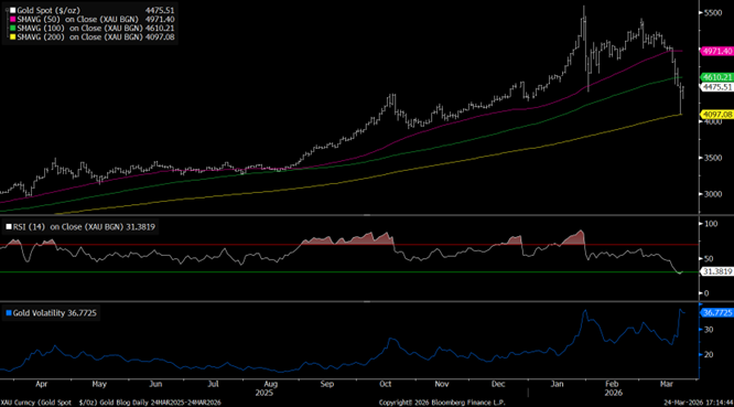 While the metal does have some well-known historical tendencies, at times, it can break free of these longstanding patterns and trade to its own tune, reflective not in surface-level drivers but the deeper plumbing of the market. The effective closure of the Strait of Hormuz, combined with surging crude oil prices and rising inflation fears, lifted U.S. Treasury yields, pushed out expectations for rate cuts, and strengthened the U.S. dollar, a move amplified by last week’s hawkish‑leaning Federal Reserve press conference. The collision of these dynamics makes for a notable headwind in gold’s relative attractiveness, which experiences a rising opportunity cost when expectations of higher-for-longer rates increase (gold doesn’t pay interest). Simultaneously, dented risk appetite stemming from the inflation and economic growth angst pushed traders to cover their losses in other areas of the market, meet margin calls, triggered stop-loss levels, and sparked a broad dash for cash via locking in gains from profitable positions in technically overbought gold after a record setting 2025 and start to 2026 (as shown below in the middle panel).